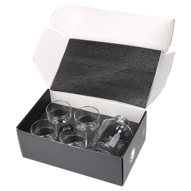 Discover sophistication with our exclusive 850ml Round Glass Decanter Set featuring four 9 oz. glasses, elegantly packaged in a deluxe gift box. El...